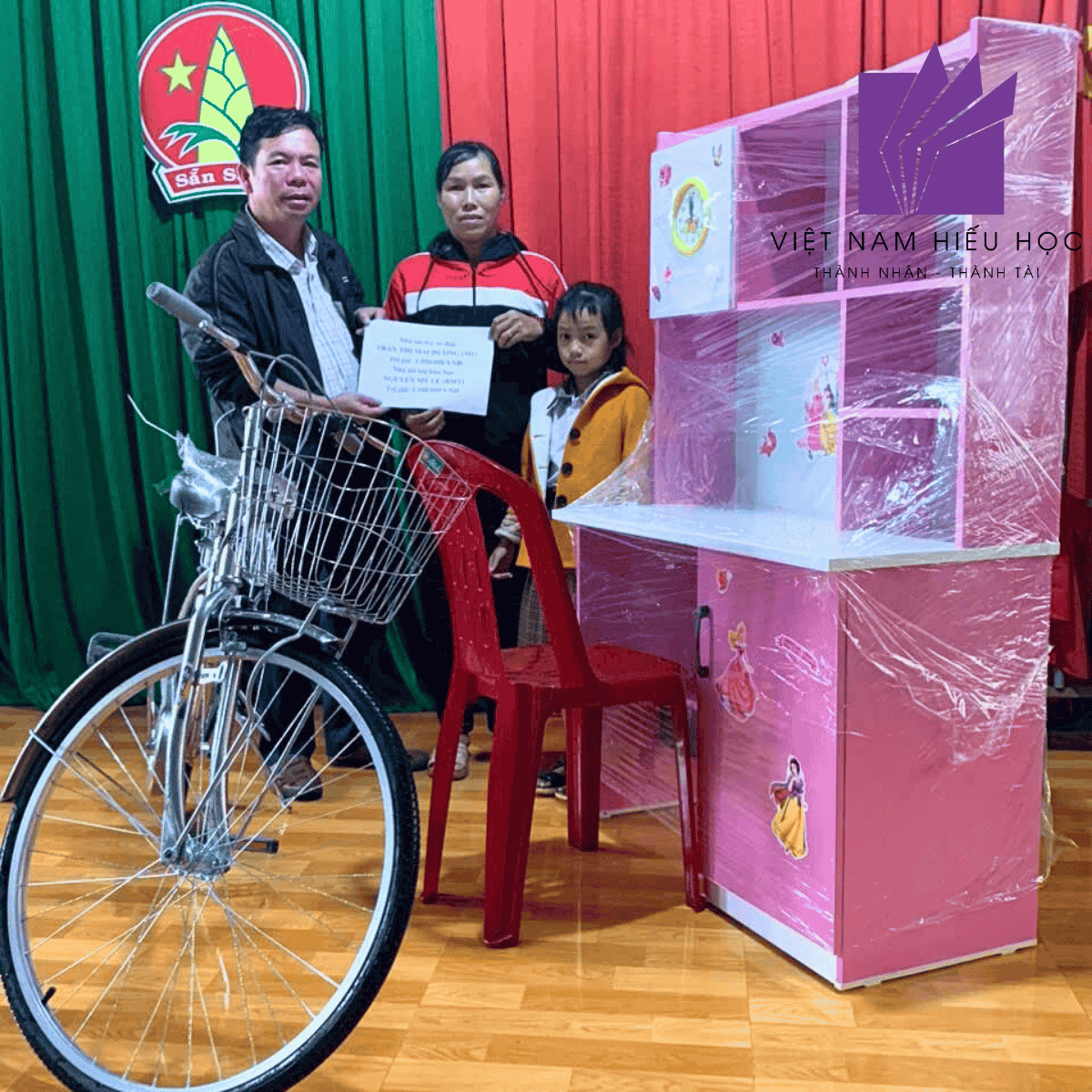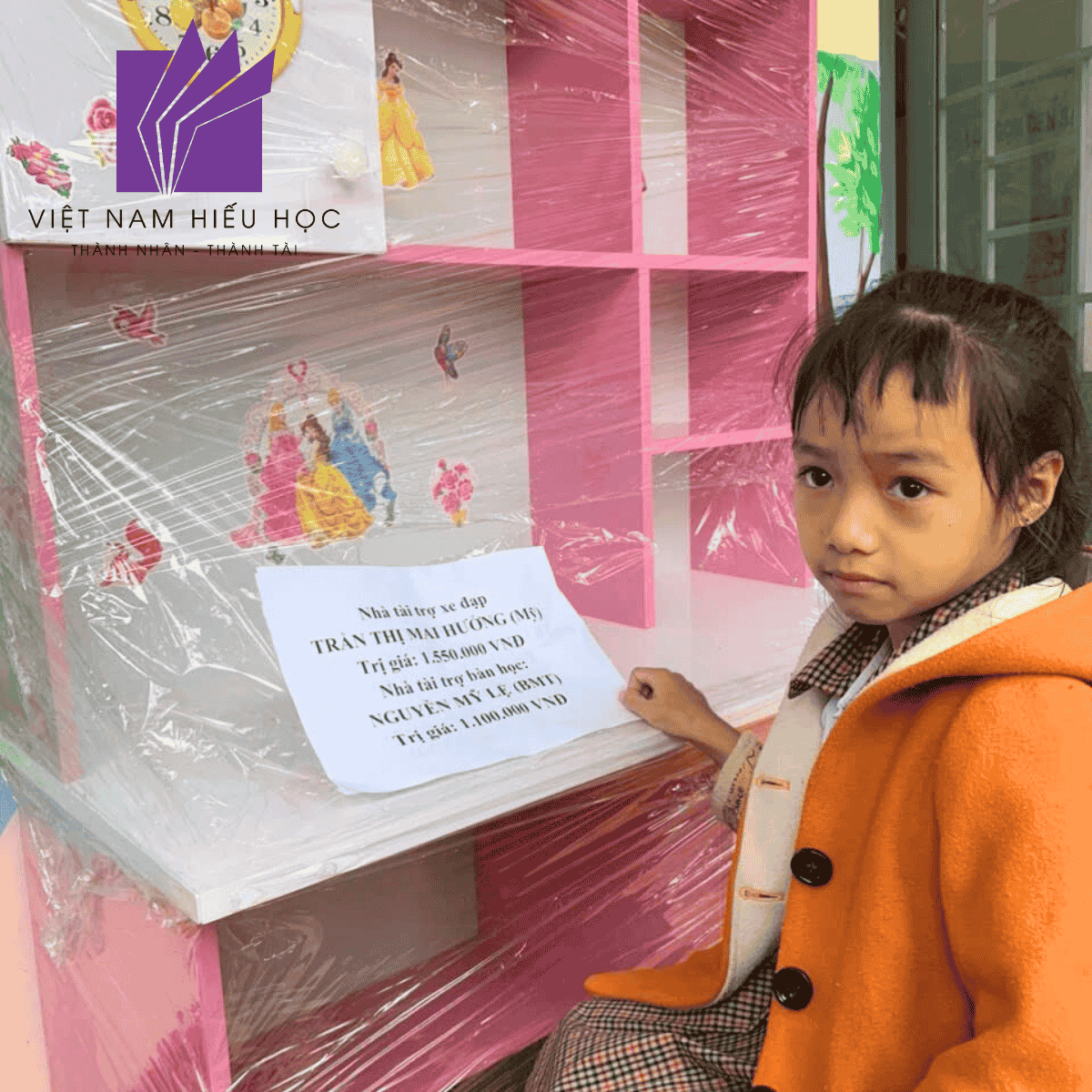 Việt Nam Hiếu Học xin gửi lời tri ân đến tấm lòng nhân ái của hai mạnh thường quân trẻ – Nguyễn Mỹ Lệ và Mai Hương Trần. Nhờ sự sẻ chia kịp thời, bé Trương Thị Thục Lam (học sinh lớp 1A1, Trường Tiểu học Nguyễn Văn Trỗi, xã Quảng Hiệp, huyện Cư M’gar) đã có được chiếc xe đạp đến trườngbàn học mới để tiếp tục việc học.